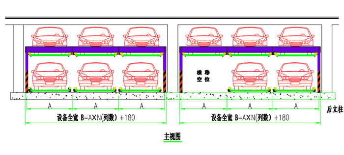 二層升降橫移 運行原理 該設(shè)備的頂層載車板可上下升降;地面層載車板做橫移,地面層留有一個空位,可以通過橫移載車板變換空位,使空位正上方的載車板下降到地面層。地面層載車板上的汽車可直接出車,完成存取過程